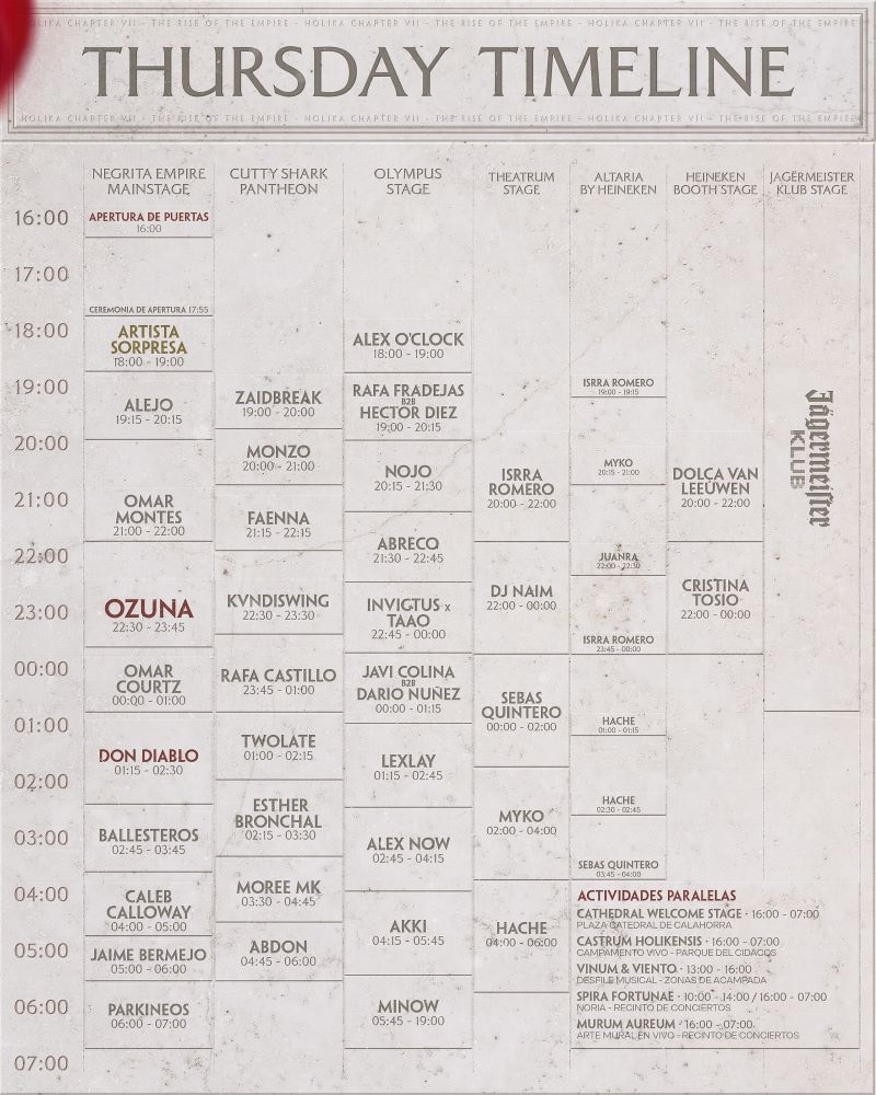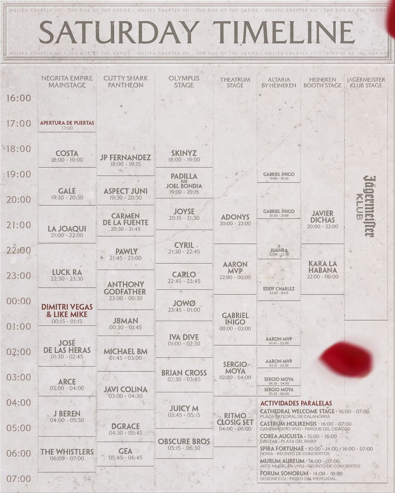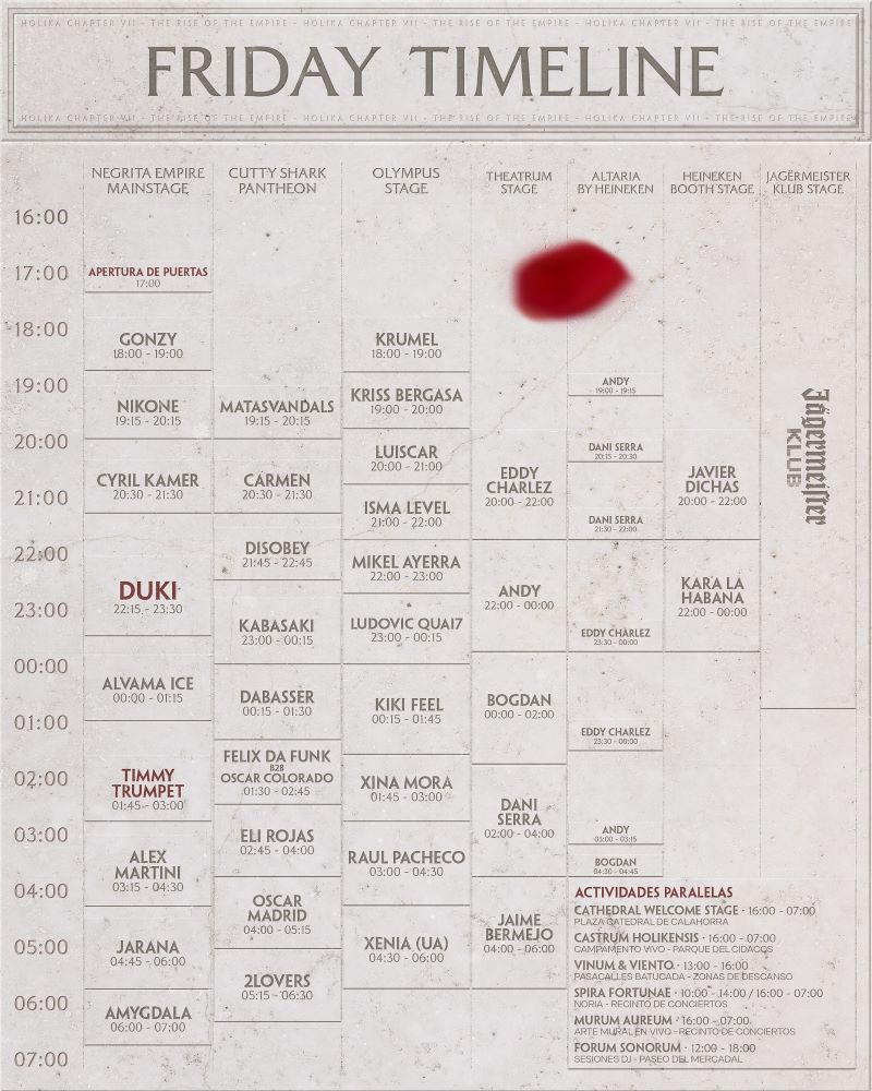 Lo prometido es deuda: aquí tienes los horarios oficiales de cada día de Holika. Organiza bien tu día, apunta tus favoritos… ¡y no llegues tarde, que luego te arrepentirás!